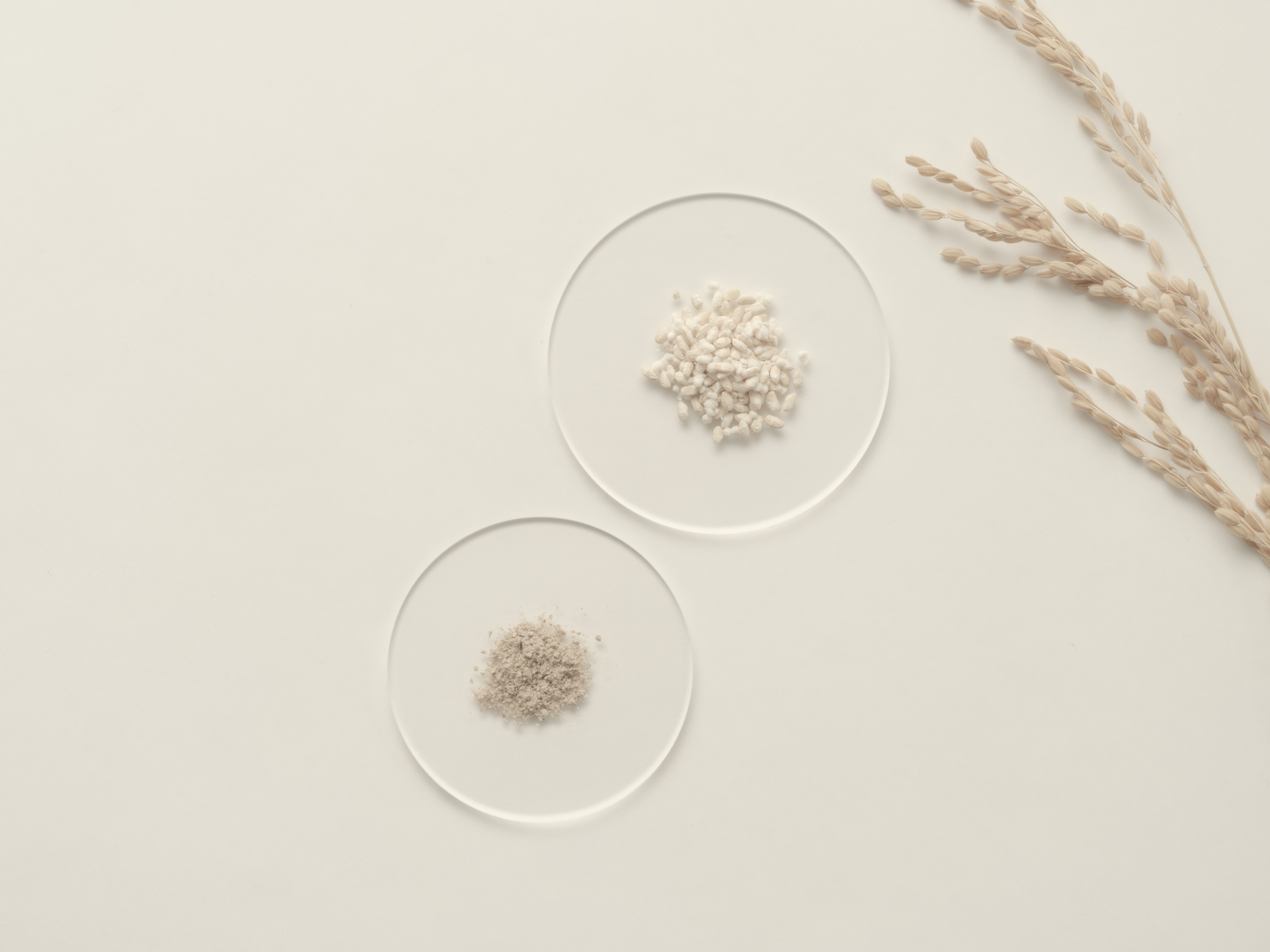 岩手県奥州市の休耕田を再生して栽培したJAS有機米由来の「オーガニック米もろみ粕エキス」と、雑穀のヒエから抽出した希少な「ヒエヌカオイル」、ふたつの国産アップサイクル